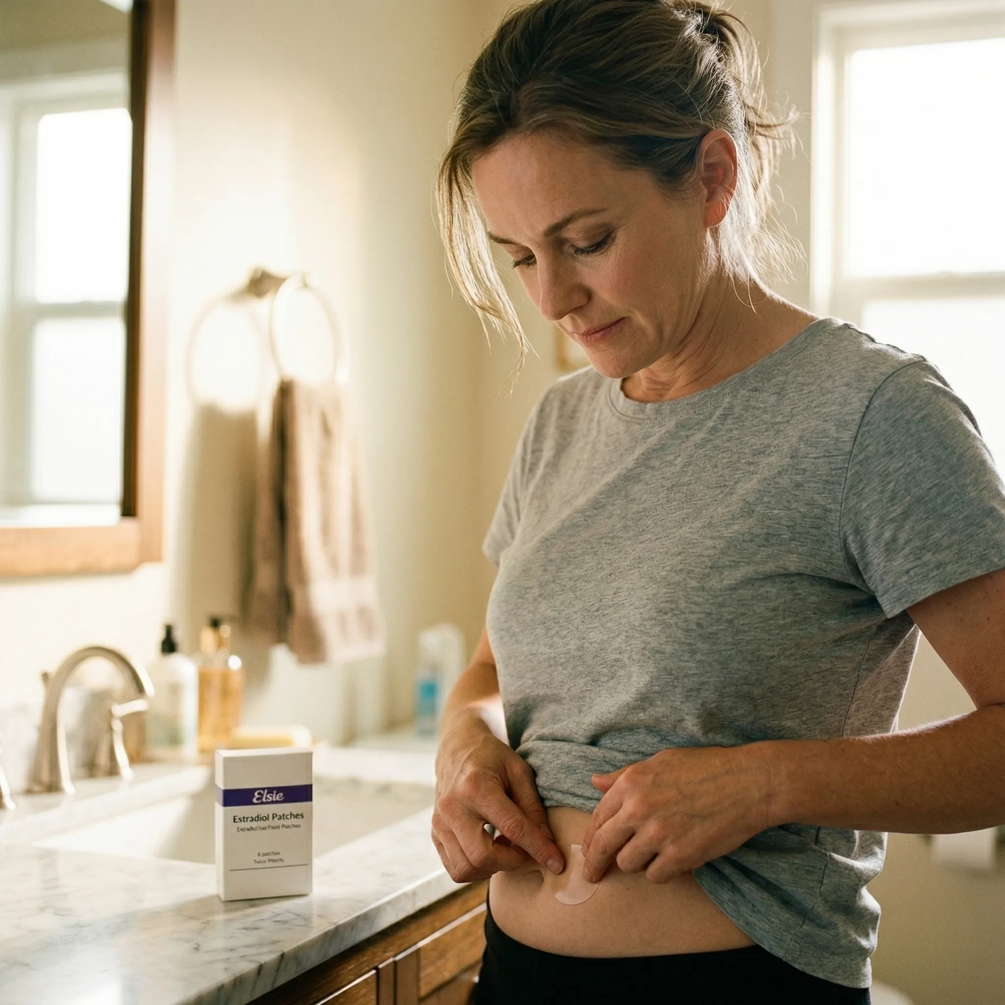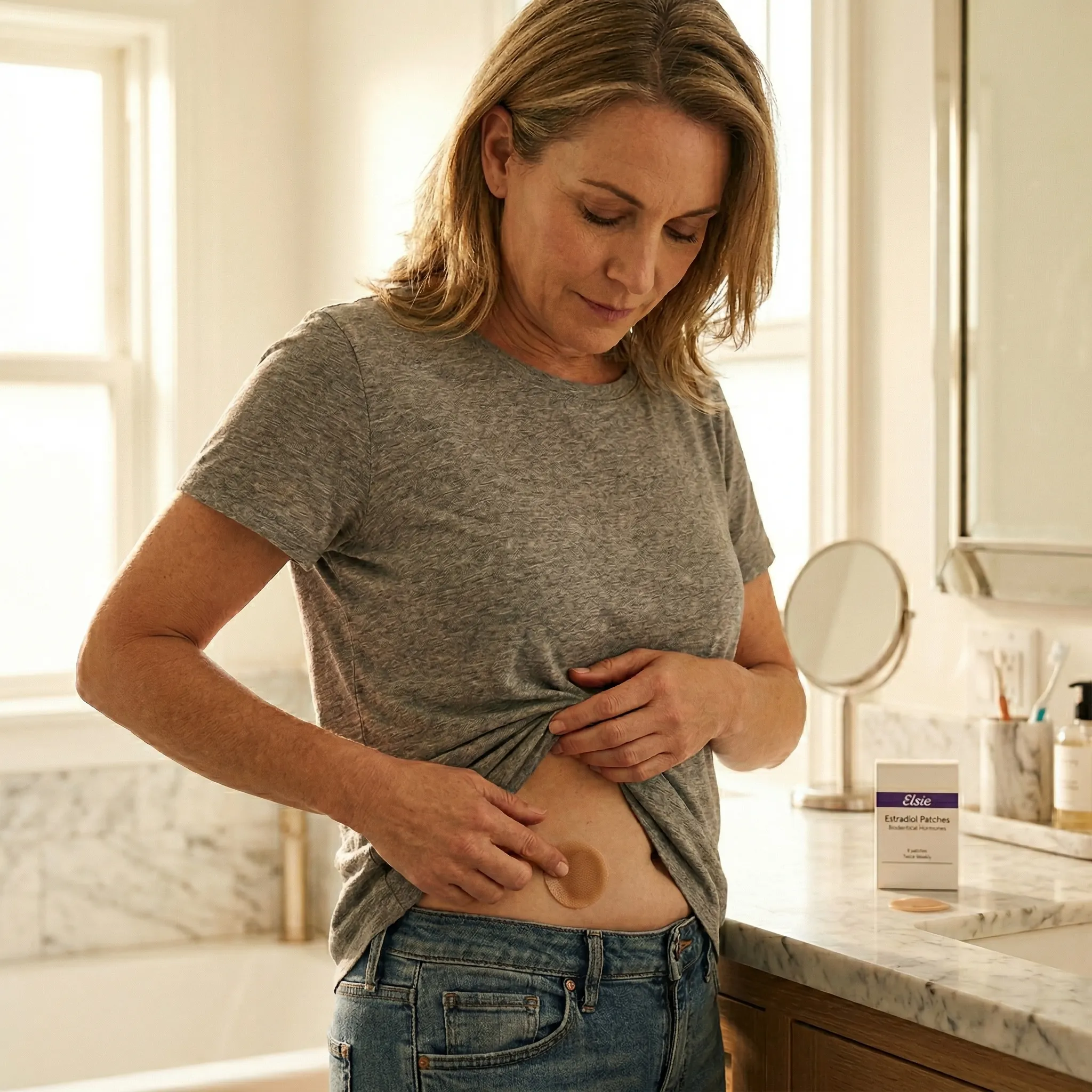 A small, discreet patch that delivers steady estradiol through the skin all week. Apply and forget — no daily routine needed.